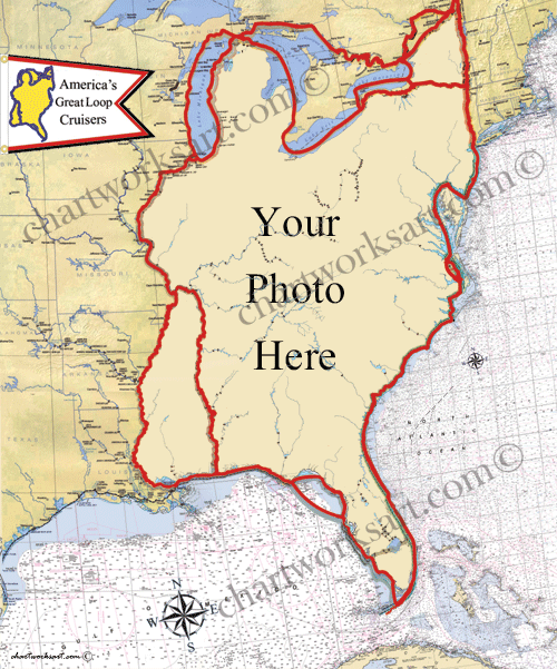 Have your cruising photo(s) included in this new art of America's Great Loop route. This map and chart includes all rivers, lakes and locks along the way!. You can choose to have either the large or small opening in the map design. This design comes with or with-out the red loop highlight and with or with-out the rivers, lake & locks overlay. You choose. The artwork is printed as an archival giclee print on water-proof canvas and coated with a clear gloss coating. Your canvas artwork will be gallery wrapped (with the image wrapped around the sides) and ready for hanging on the wall. 20" x 24" is also a "standard" size so you can easily purchase a frame if you choose to. The Artwork is adhered to a rigid foam backing and is designed for using push-pins to mark your travels. It's made to bring aboard your boat, and last. SAVE YOUR CAMERA OR SMART-PHONE PHOTOS ON YOUR COMPUTER. UPLOAD YOUR FAVORITE PHOTO FROM YOUR COMPUTER WITH THE FORM TO THE LEFT. You will receive a confirmation number, please write it down. You have choices on this image as well. The Loop route can be displayed in Red. Choose to have the small rivers and lakes included or not. CLICK "BUY NOW" TO PROCEED TO CHECK-OUT" Please include your photo confirmation number and any requests in the "notes to seller" at check-out. I will forward you a proof for your approval before printing. If you have any questions or would like to e-mail your photo directly to me, send it to chartworksart@hotmail.com Thank You! |